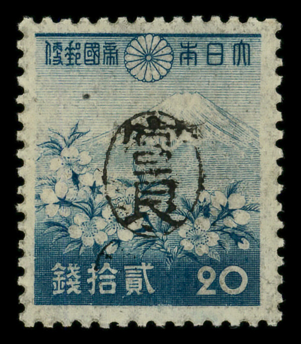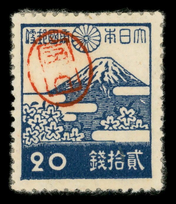 8441 ng 3X15 imageMiyako District, 1946, Postmaster Tomiyama's handstamped seal on Mt. Fuji and Cherry Blossoms, typographed, 20s blue (Scott 3X15), stuck down, Very Fine to Extremely Fine.