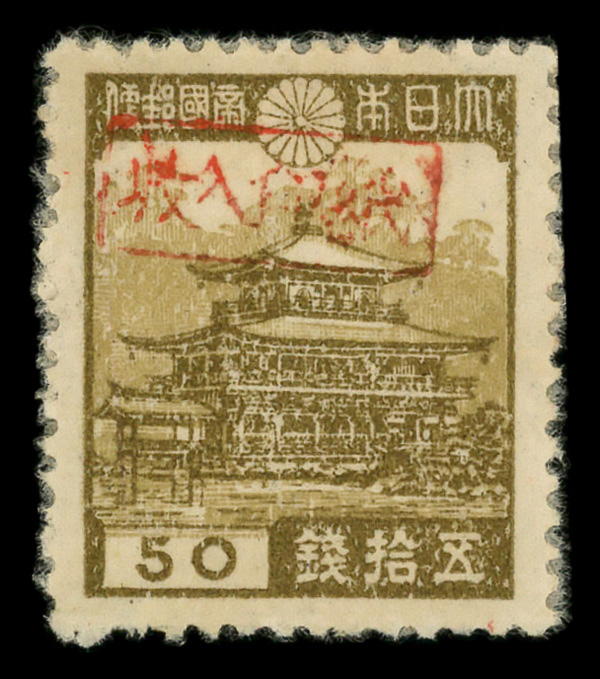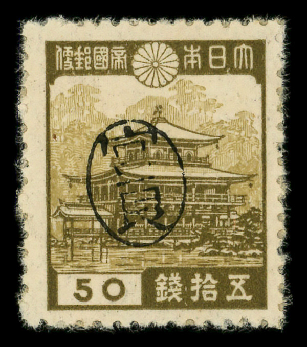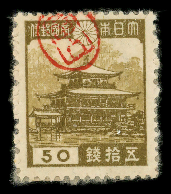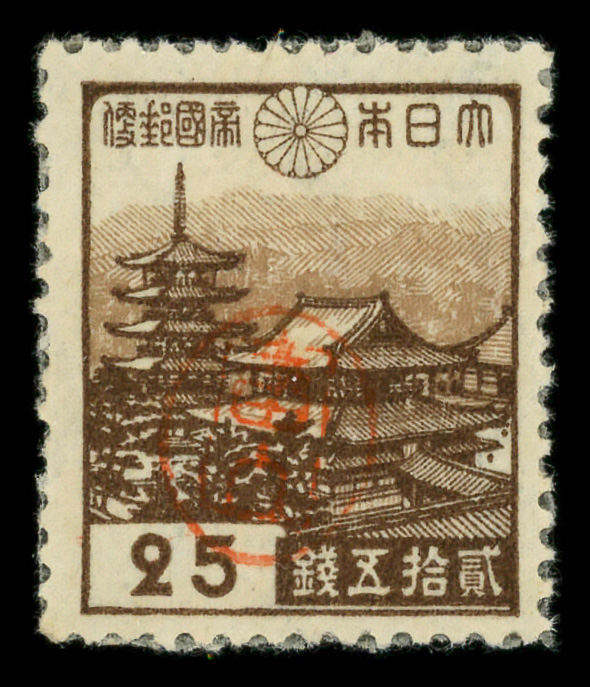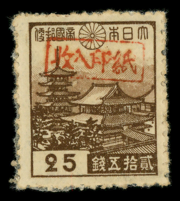 8442 ng 3X17 imageMiyako District, 1946, Postmaster Tomiyama's handstamped seal on Horyu Temple in Nara, 25s dark brown & pale brown (Scott 3X17), stuck down, Fine to Very Fine.