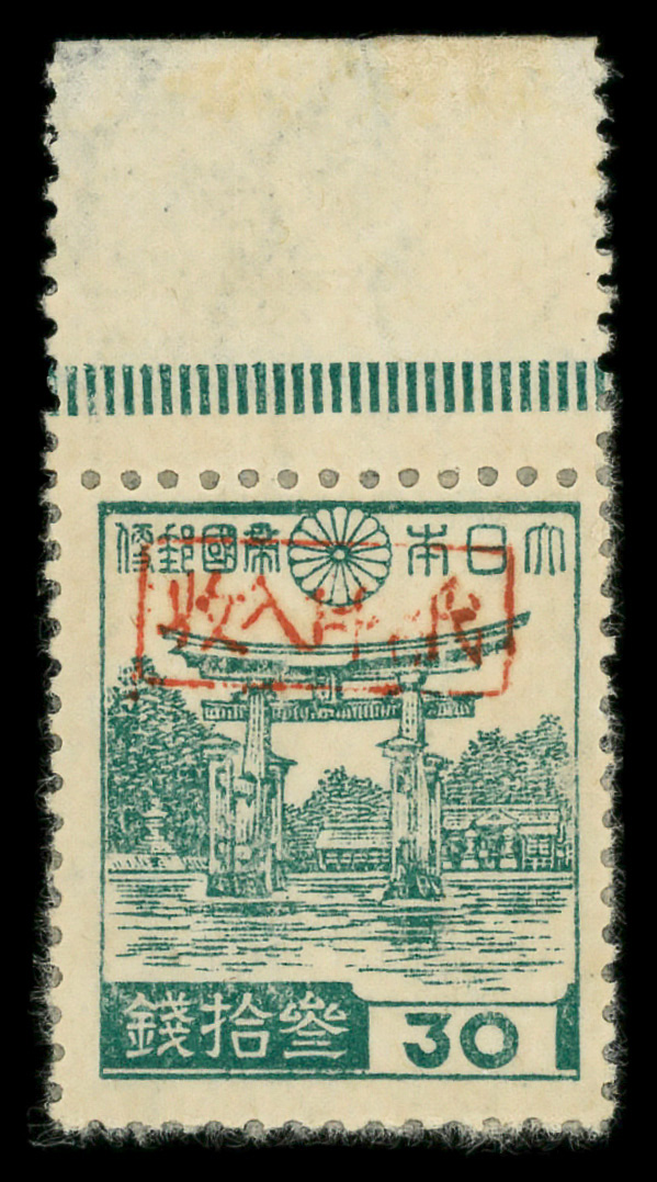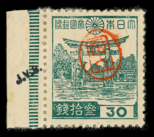 8443 ng 3X18 imageMiyako District, 1946, Postmaster Tomiyama's handstamped seal on Miyajima Torii, 30s bluish green (Scott 3X18), stuck down, Extremely Fine.