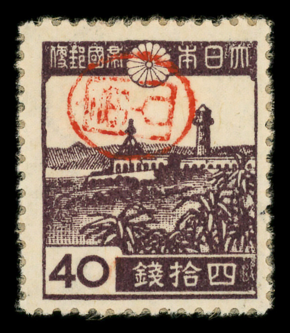 8444 ng 3X20 imageMiyako District, 1946, Postmaster Tomiyama's handstamped seal on Garambi Lighthouse, typographed, 40s dark violet (Scott 3X20), stuck down, Fine to Very Fine.