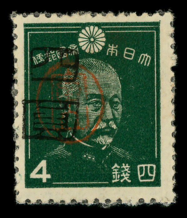 8449 ng 3X29 imageMiyako District, 1947, handstamped surcharge on Admiral Togo, 4y on 4s dark green (Scott 3X29), stuck down, Fine to Very Fine.
