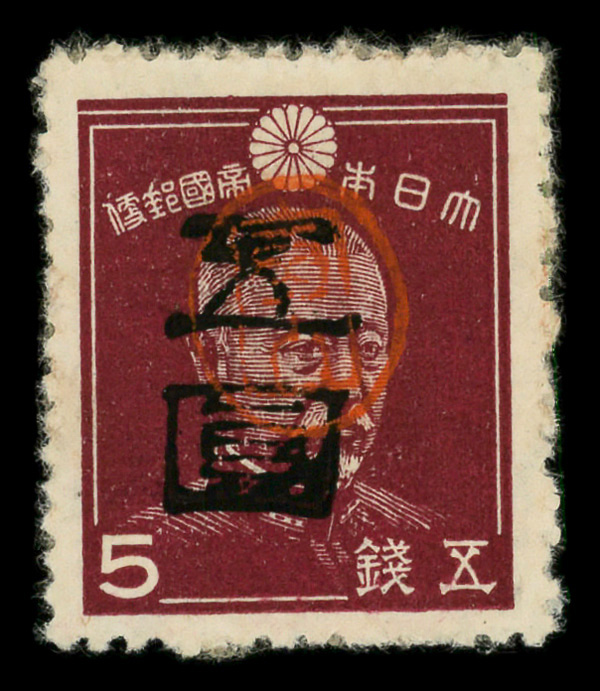 8450 ng 3X30 imageMiyako District, 1947, handstamped surcharge on Admiral Togo, 5y on 5s brown lake (Scott 3X30), stuck down, Very Fine.