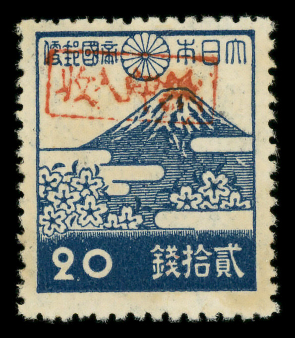 8459 nh 5X5 imageYaeyama District, 1948, Postmaster Miyara's handstamped seal on Mt. Fuji and Cherry Blossoms, 20s ultramarine (Scott 5X5), o.g., never hinged (owner's handstamp on gum) (pencil mark on gum), Fine to Very Fine.