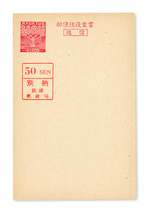 8517 nh UY6a imagePaid Reply Postal Card, 1951, 50s typographed surcharge on 50s carmine red on gray cream, reply card (Scott UY6a), o.g., never hinged, Extremely Fine.