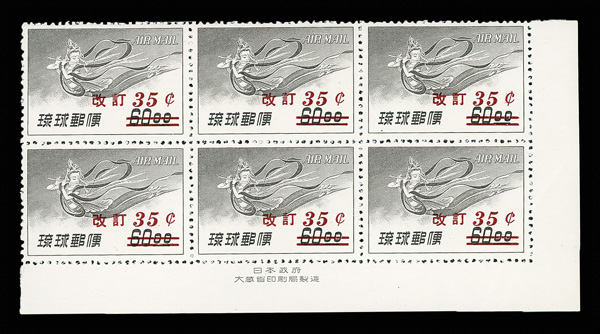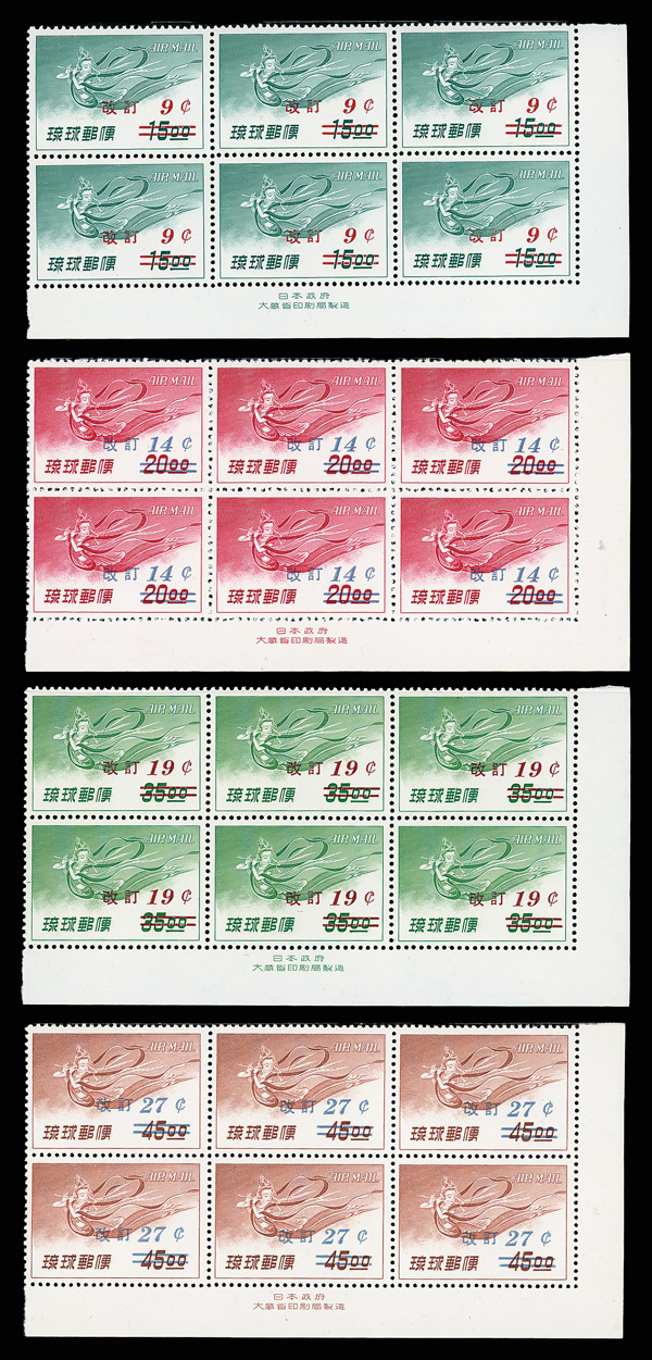 8503 nhbl C14-C18 imageAirmail, 1959, surcharges on 3rd Issue, 9¢-35¢ complete (Scott C14-C18), set of 5, imprint blocks of 6, o.g., never hinged, Extremely Fine.