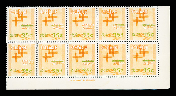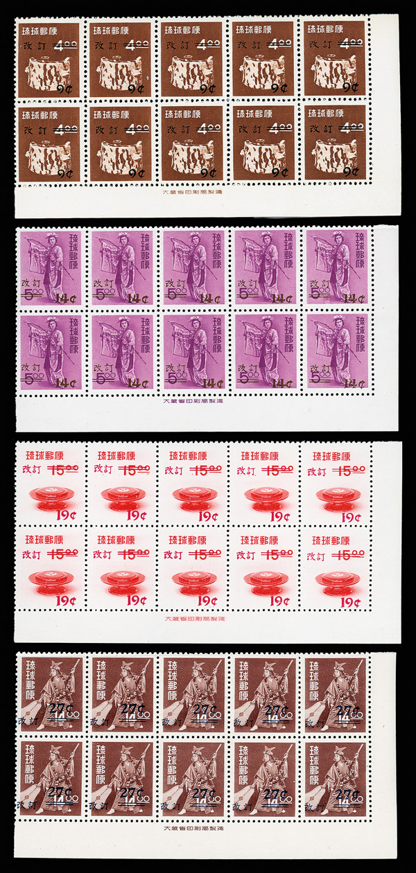 8504 nhbl C19-C23 imageAirmail, 1960, surcharges on Regular Issues, 9¢-35¢ complete (Scott C19-C23), set of 5, imprint blocks of 10, o.g., never hinged, Extremely Fine.