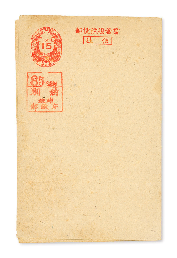 8515 nh UY4q imagePaid Reply Postal Card, 1951, 85s handstamped surcharge type "d" on 15s+15s vermilion on tan, unsevered (Scott UY4q), o.g., never hinged; lightly toned spots, Very Fine.