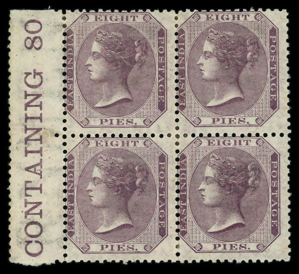 8905 ogbl 21 image1865, Queen Victoria "Crown Colony" Issue, 8p purple (Scott 21), left margin block of 4 with part inscription, disturbed o.g., Very Good.