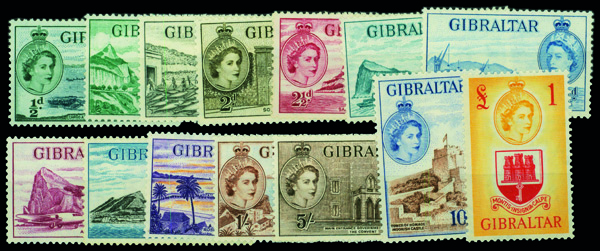 8895 og 132-145 image1953, Queen Elizabeth II Pictorials, ½d to £1 complete (Scott 132-145), complete set of single, o.g., lightly hinged, Very Fine.