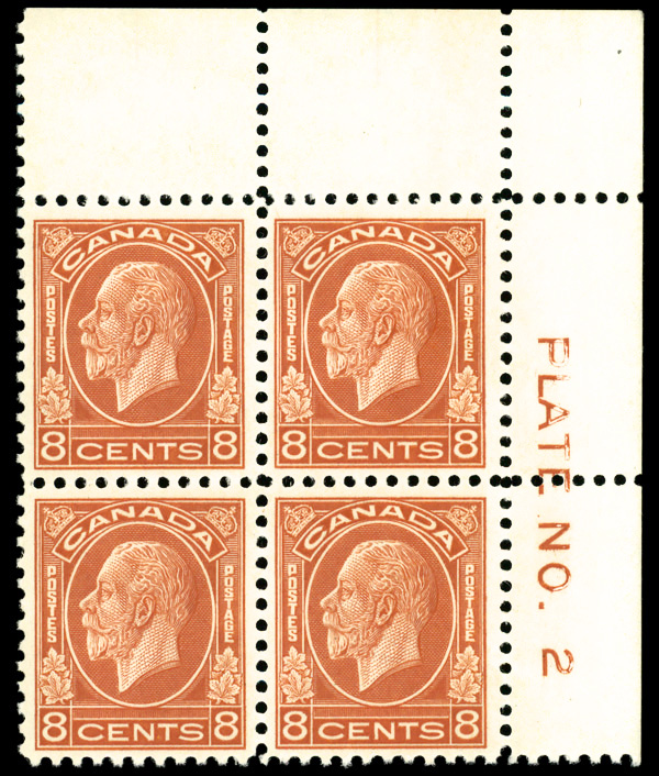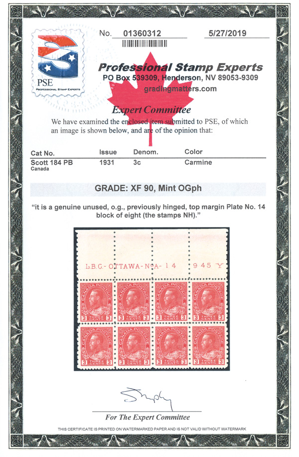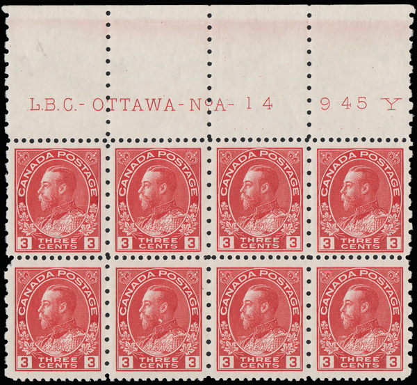 9062 nh/ogbl 184 image1931, King George V "Admiral", 3¢ carmine, perf. 12 x 8 (Scott 184), top Imprint & Plate No. 14 block of 8, o.g., stamps never hinged, Very Fine, with a 2019 P.S.E. certificate.