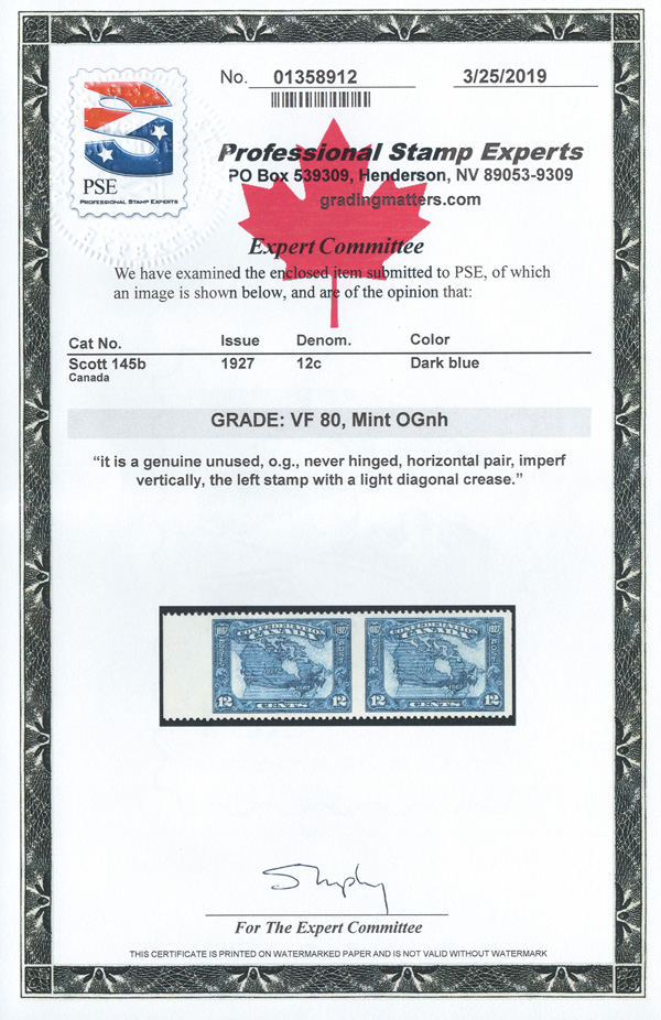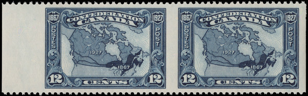 9047 nh 145b image1927, 12¢ Confederation, horizontal pair, imperf vertically (Scott 145b), left sheet margin pair, o.g., never hinged, fresh and beautifully centered; left stamp with a light diagonal bend (called a "ilight crease" on the accompanying certificate), Very Fine. 250 pairs belived to exist., with a 2019 P.S.E. certificate graded VF 80.