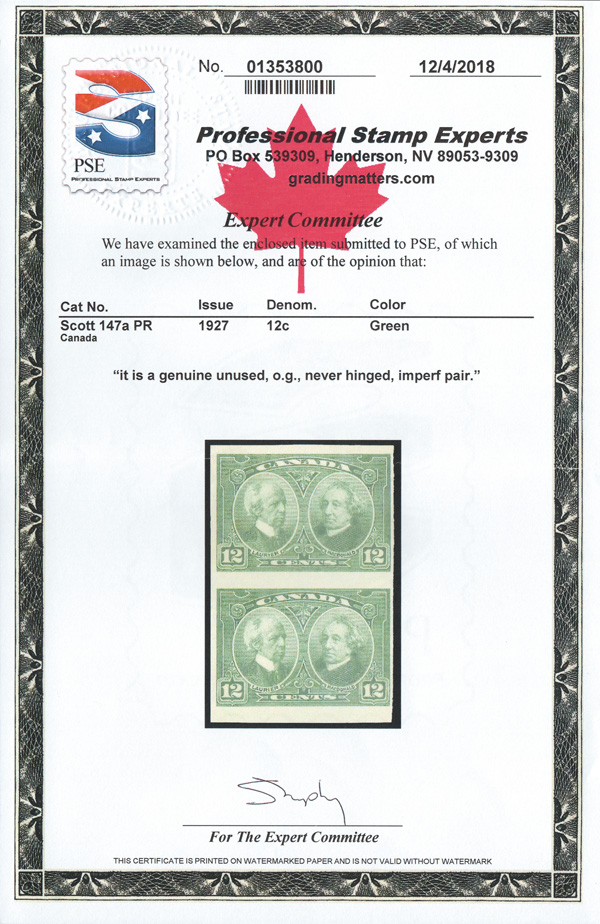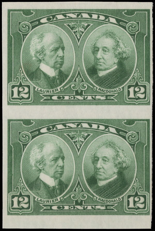 9050 nh 147a image1927, 12¢ Laurier & Mcdonald, imperf (Scott 147a), vertical pair, o.g., never hinged, bright and fresh; but small margin at the right, Fine. 250 pairs belived to exist., with a 2018 P.S.E. certificate.