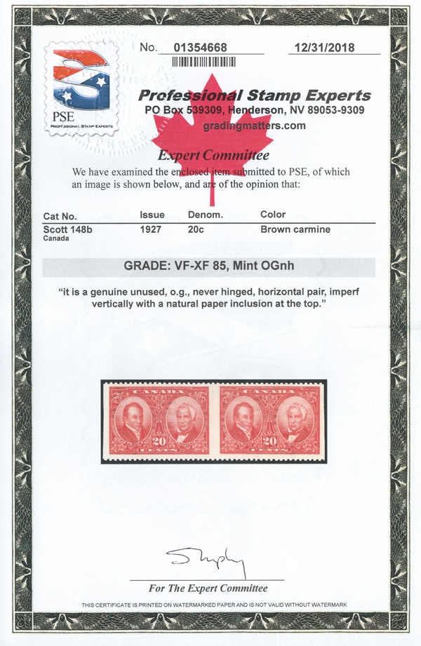9052 nh 148b image1927, 20¢ Baldwin & Lafontaine, horizontal pair, imperf vertically (Scott 148b), o.g., never hinged, fresh and well centered; minute natural paper inclusion between stamps at the top, Very Fine to Extremely Fine. 250 pairs belived to exist., with a 2018 P.S.E. certificate graded VF-XF 85 noting the inclusion.
