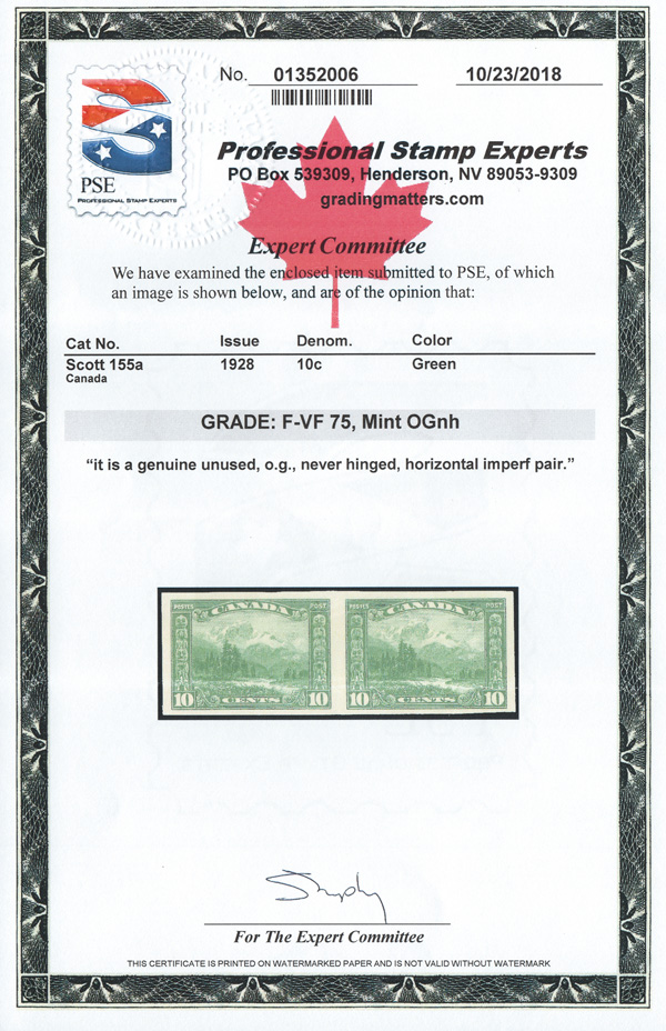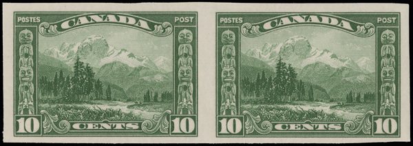 9055 nh 155a image1928, 10¢ Mt. Hurd, imperf (Scott 155a), horizontal pair, o.g., never hinged, Fine to Very Fine. 250 pairs are believed to exist., with a 2018 P.S.E. certificate graded F-VF 75.