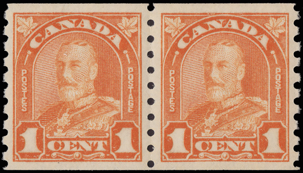 9059 nh 178 image1930, King George V "Maple Leaf", 1¢ orange, horizontal coil, perf. 8½ vertically (Scott 178), a gorgeous pair, o.g., never hinged, bright, fresh and beautifully centered, Extremely Fine, with a 2022 P.S.E. certificate graded XF 90.