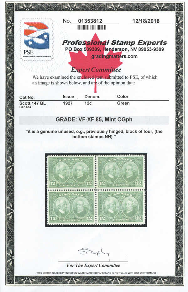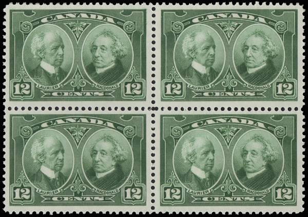 9049 nh/ogbl 147 image1927, 12¢ Laurier & Mcdonald (Scott 147), a fresh, nicely centered block of 4, o.g., bottom stamps never hinged, Very Fine to Extremely Fine, with a 2018 P.S.E. certificate graded VF-XF 85.