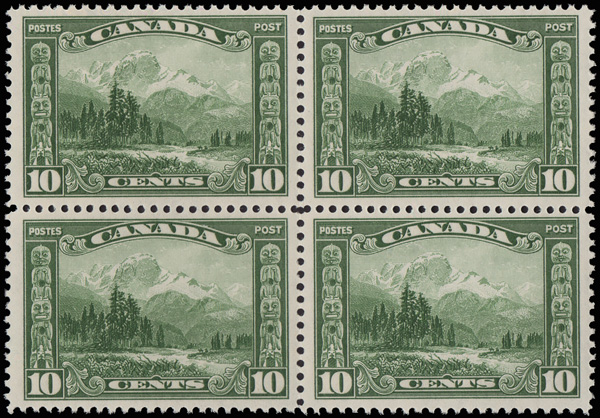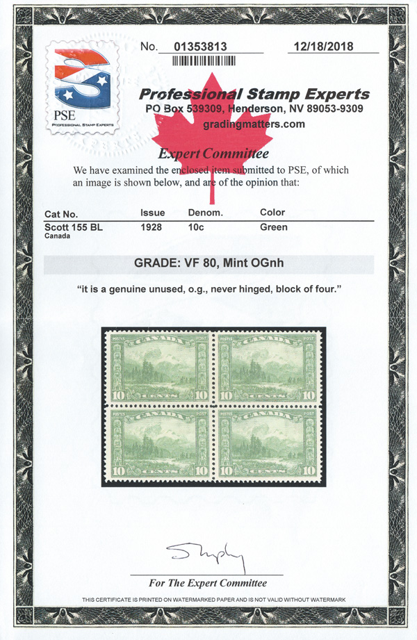 9054 nhbl 155 image1928, 10¢ Mt. Hurd (Scott 155), a fresh, well centered block of 4, o.g., never hinged, Very Fine, with a 2018 P.S.E. certificate graded VF 80.