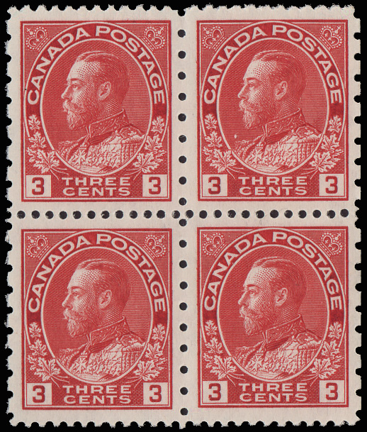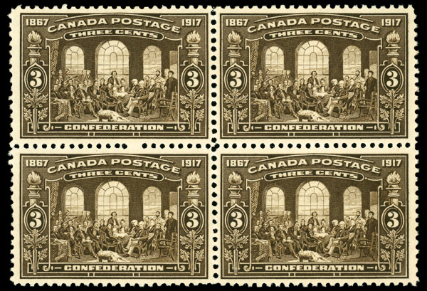 9042 nhbl 135 image1917, 3¢ Confederation (Scott 135), block of 4 (minor perf separation), o.g., never hinged, Very Fine to Extremely Fine.