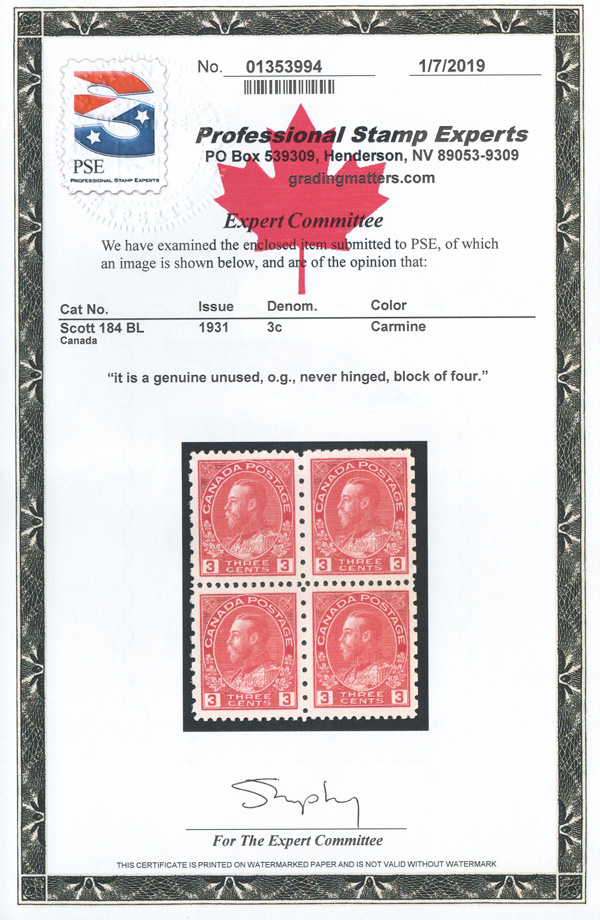 9061 nhbl 184 image1931, King George V "Admiral", 3¢ carmine, perf. 12 x 8 (Scott 184), an exceptional block of 4, o.g., never hinged, post office fresh and virtually perfectly centered, Extremely Fine, with a 2019 P.S.E. certificate.