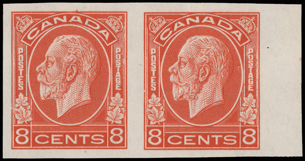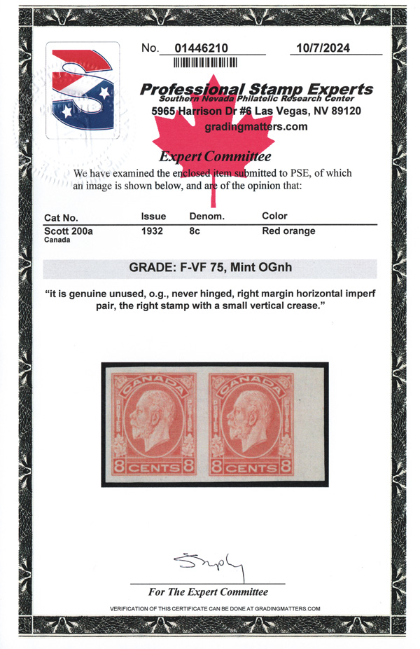 9066 nh 200a image1932, King George V "Medallion", 8¢ red orange, imperf (Scott 200a), an marvelous right sheet margin horizontal pair, o.g., never hinged, left margin and brilliant color; the right stamp with a small vertical crease, Very Fine. Only 150 pairs were available., with a 2024 P.S.E. certificate graded VF 80, despite the crease.