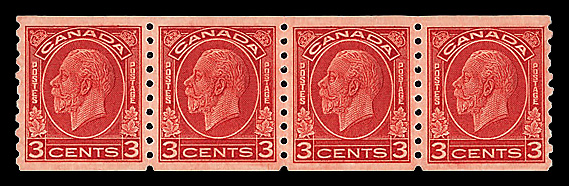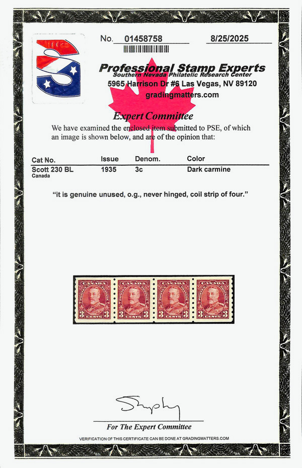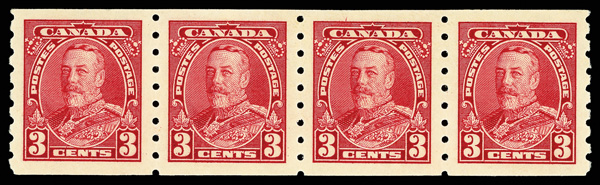 9078 nh 230 image1935, King George V, 3¢ dark carmine, horizontal coil, perf. 8 vertically (Scott 230), strip of 4, o.g., never hinged, immaculate with bold color, crisp detail, and superior centering, Very Fine to Extremely Fine, with 2025 P.S.E. certificate.