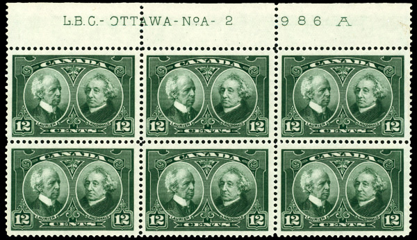 9051 nhbl 148 image1927, 20¢ Baldwin & Lafontaine (Scott 148), plate block of 6, o.g., never hinged, Extremely Fine.