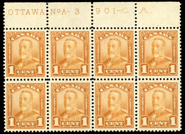 9053 nhbl 149 image1928, King George V "Scroll", 1¢ orange (Scott 149), plate block of 8 (perf separations), o.g., never hinged, Very Fine to Extremely Fine.