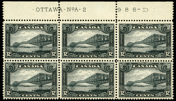9056 nhbl 156 image1929, 12¢ Quebec Bridge (Scott 156), plate block of 6, o.g., never hinged, Very Fine.