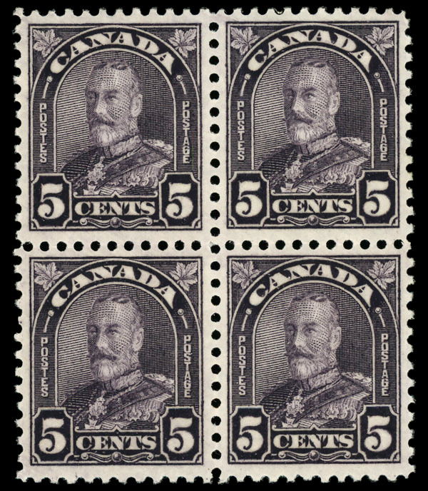 9057 nh/ogbl 169 image1930, King George V "Maple Leaf", 5¢ dull violet, rotary press printing, perf. 11¼ x 11 (Scott 169), block of 4, o.g., lightly hinged (2 stamps never hinged), Very Fine.