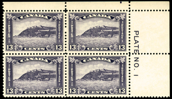 9067 nhbl 201 image1932, Quebec Citadel, 13¢ dull violet (Scott 201), plate block of 4, o.g., never hinged, Very Fine to Extremely Fine.