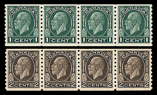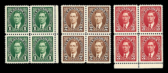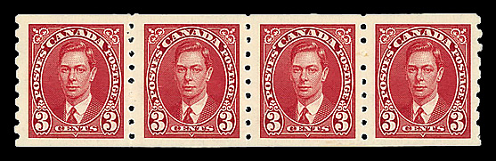 9080 nh 238-240 image1937, King George VI, horizontal coils, perf. 8 vertically, 1¢ to 3¢ complete (Scott 238-240), set of 3, strips of 4, o.g., never hinged, Very Fine to Extremely Fine.