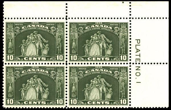9073 nhbl 209 image1934, 10¢ United Empire Loyalists (Scott 209), plate block of 4, o.g., never hinged, Very Fine to Extremely Fine.