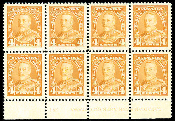 9074 nhbl 220 image1935, King George V, 4¢ yellowish orange (Scott 220), plate block of 8, o.g., never hinged, Extremely Fine.