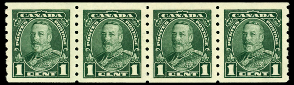 9076 nh 228 image1935, King George V, 1¢ green, horizontal coil, perf. 8 vertically (Scott 228), strip of 4, o.g., never hinged, Very Fine to Extremely Fine.