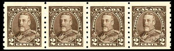 9077 nh 229 image1935, King George V, 2¢ brown, horizontal coil, perf. 8 vertically (Scott 229), strip of 4, o.g., never hinged, Very Fine.