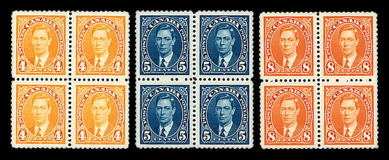 9079 nhbl 231-236 image1937, King George VI definitives, 1¢ to 8¢ complete (Scott 231-236), set of 6, blocks of 4, o.g., never hinged, Extremely Fine.