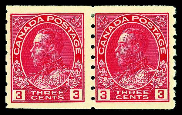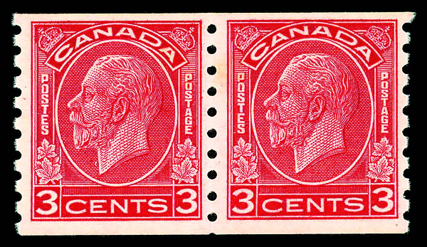 9072 nh 207 image1933, King George V "Medallion", 3¢ deep red, horizontal coil, perf. 8½ vertically (Scott 207), pair, o.g., never hinged, Fine to Very Fine.