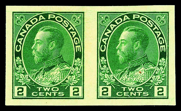 9044 og 137 image1924, King George V "Admiral", 2¢ green, imperf. (Scott 137), pair, o.g., lightly hinged, Fine to Very Fine.