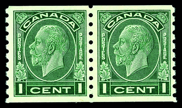 9070 nh 205 image1933, King George V "Medallion", 1¢ dark green, horizontal coil, perf. 8½ vertically (Scott 205), pair, o.g., never hinged, Fine to Very Fine.
