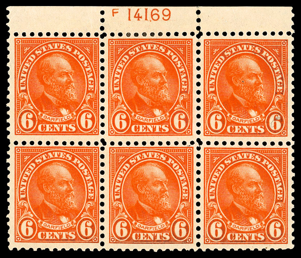 8112 nh/ogbl 558 image1922, 6¢ Garfield (Scott 558), top margin F plate block of 6, o.g., top center stamp with hinge remnant, other stamps never hinged, captivating deep rich color; light pencil mark on lower right stamp, Fine to Very Fine.