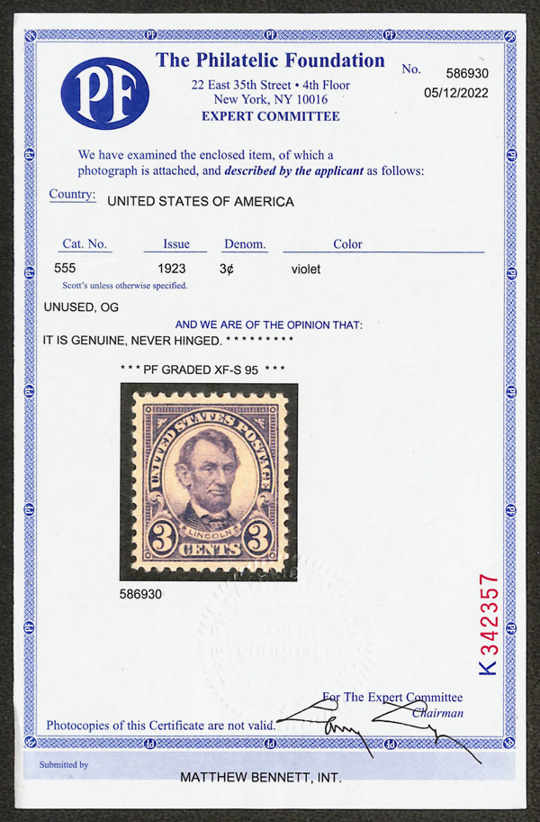 8109 nh 555 image1923, 3¢ Lincoln (Scott 555), wide, perfectly aligned margins, o.g., never hinged, Extremely Fine to Superb, with 2022 P.F. certificate graded XF-SUP 95.