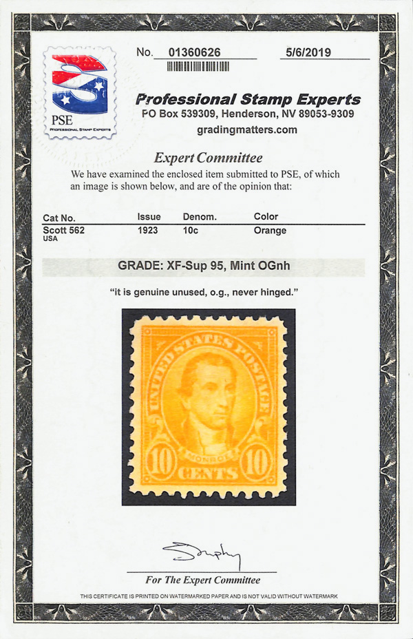 8118 nh 562 image1923, 10¢ Monroe (Scott 562), fresh as issued, massive framed margins, o.g., never hinged, Extremely Fine to Superb, with 2019 P.S.E. certificate graded XF-SUP 95.