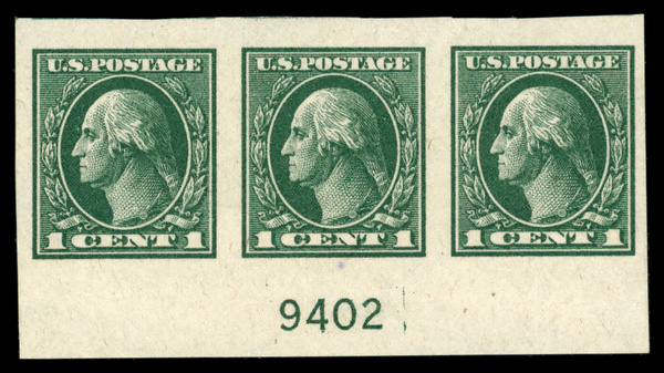 8099 nh 531 image1919, 1¢ green, offset printing, imperf. (Scott 531), strip of 3 with plate number, o.g., never hinged (tiny ink spot), Very Fine to Extremely Fine.