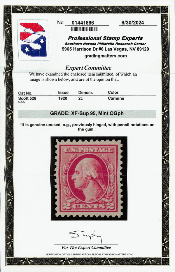 8093 og 526 image1920, 2¢ carmine, type IV, offset printing (Scott 526), o.g., very lightly hinged (pencil marks on gum), Extremely Fine to Superb, with 2024 P.S.E. certificate graded XF-SUP 95.