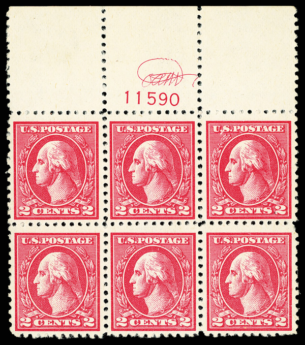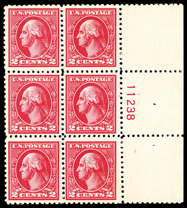 8095 nhbl 527 image1918, 2¢ carmine, type V, offset printing (Scott 527), wide right margin plate block of 6 with plate number 11238, Clean freshness and depth combined, o.g., never hinged, Fine to Very Fine.