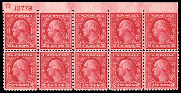 8104 nhbl 540 image1919, 2¢ carmine rose, type II, rotary press coil waste, perf. 11 x 10 (Scott 540), top margin plate block of 10 with star, Handsome centering balance, imperf along top margin, o.g., never hinged, Fine to Very Fine.