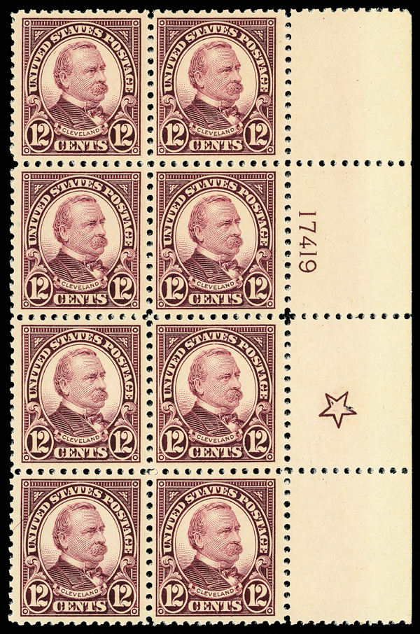 8119 nhbl 564 image1923, 12¢ Grover Cleveland (Scott 564), right margin plate block of 8 with five point star, Borders nicely balanced, o.g., never hinged; minor perf separation at right center, Very Fine several large well centered singles.