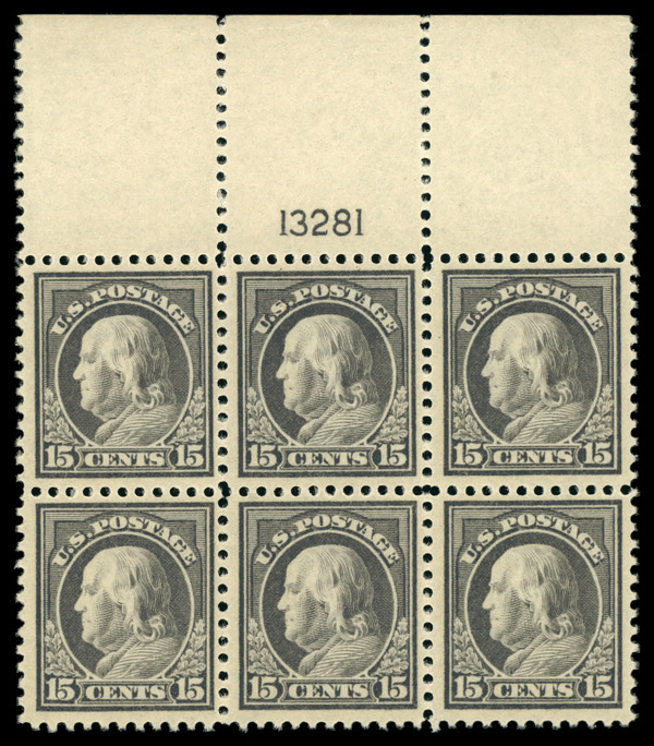 8090 nhbl 514 image1917, 15¢ gray, perf. 11 (Scott 514), plate block of 6, o.g., never hinged, Very Fine to Extremely Fine.