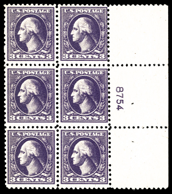 8084 nhbl 484 image1916, 3¢ violet, type II, unwatermarked, imperf. (Scott 484), wide top margin plate block of 6 with plate number 8473, Fresh, bright pigment retained, o.g., never hinged; inclusion at top, Very Fine to Extremely Fine.