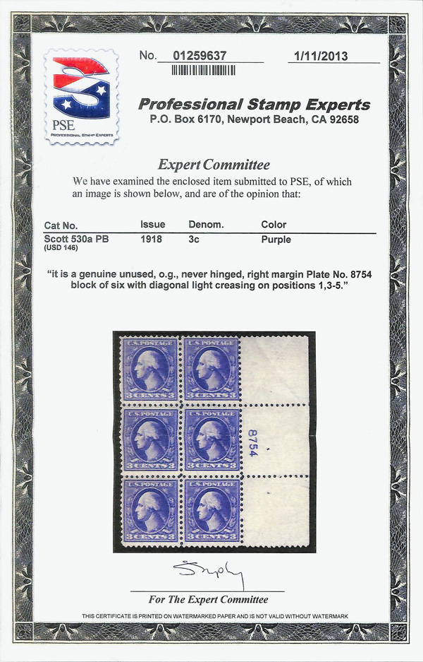 8098 nhbl 530a image1918, 3¢ purple, type IV, offset printing, double impression (Scott 530a), plate block of 6, o.g., never hinged (gum creases), Fine, with 2013 P.S.E. certificate.